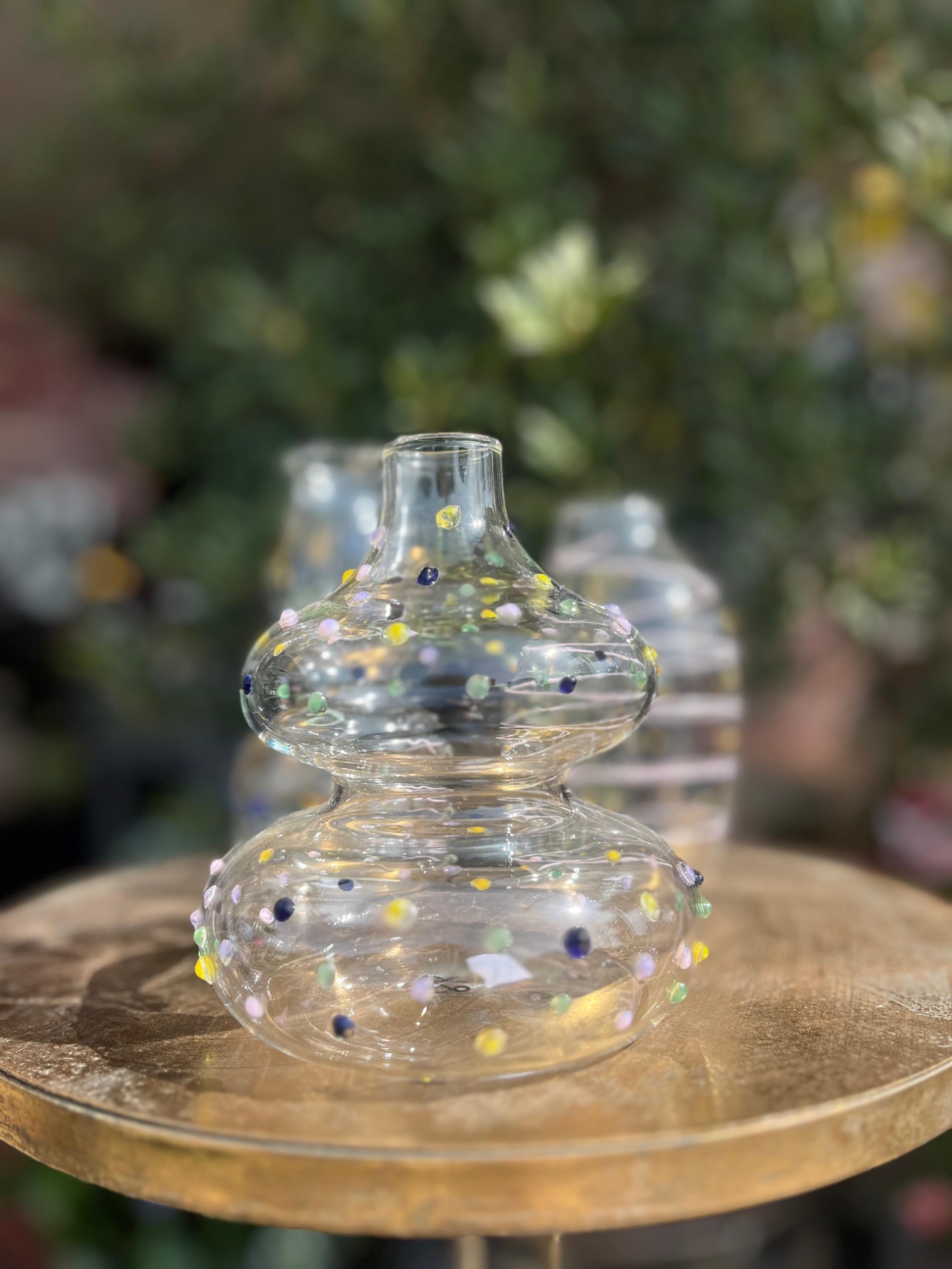 Mooi verfijnd vaasje met bonte stip voor een subtiele bloem.