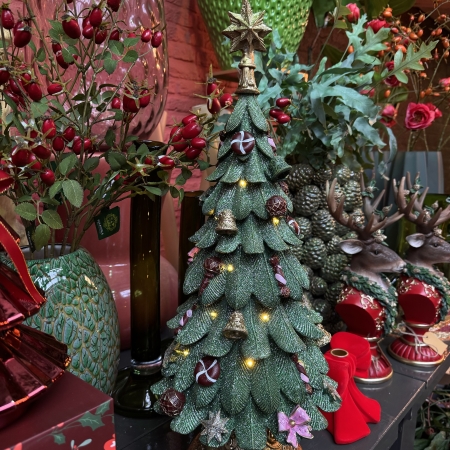 Details: rijk versierd met zuurstokken, sneeuw en miniatuurversieringen
