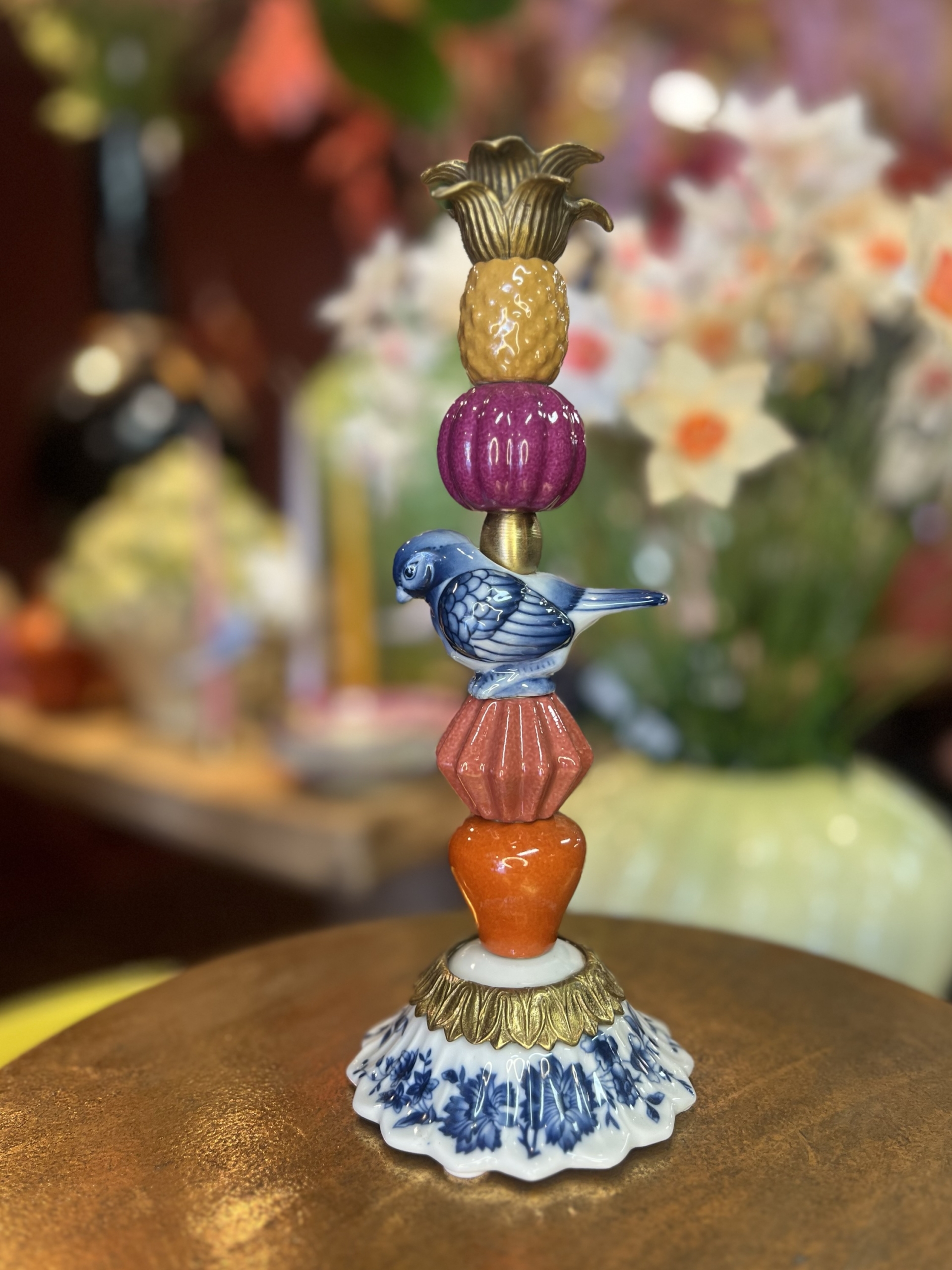Mooie kandelaar met vogel van porselein en messing.