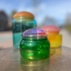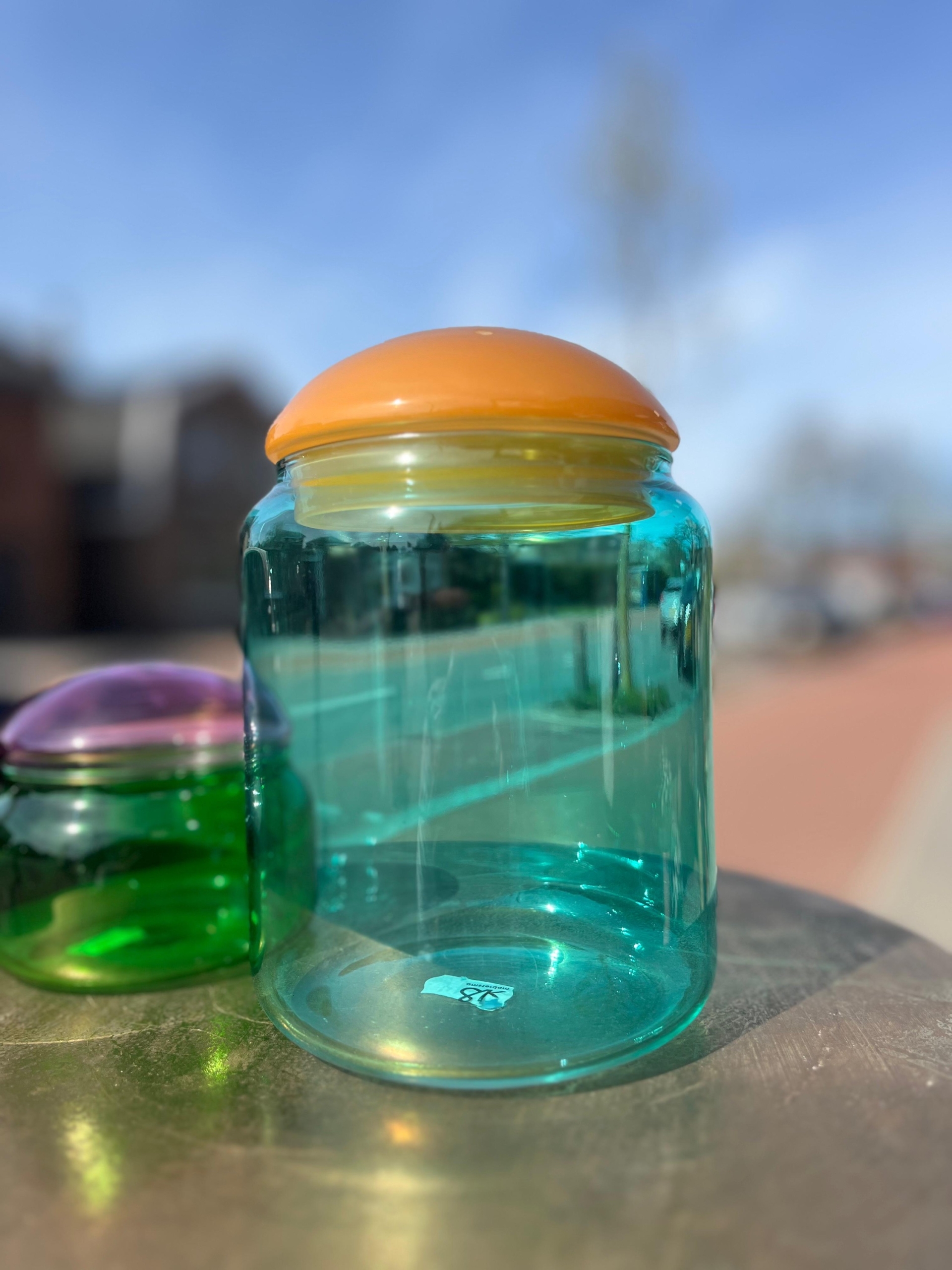 Leuke transparante glazen voorraadpot in frisse turquoise kleur en oranje deksel.
