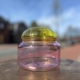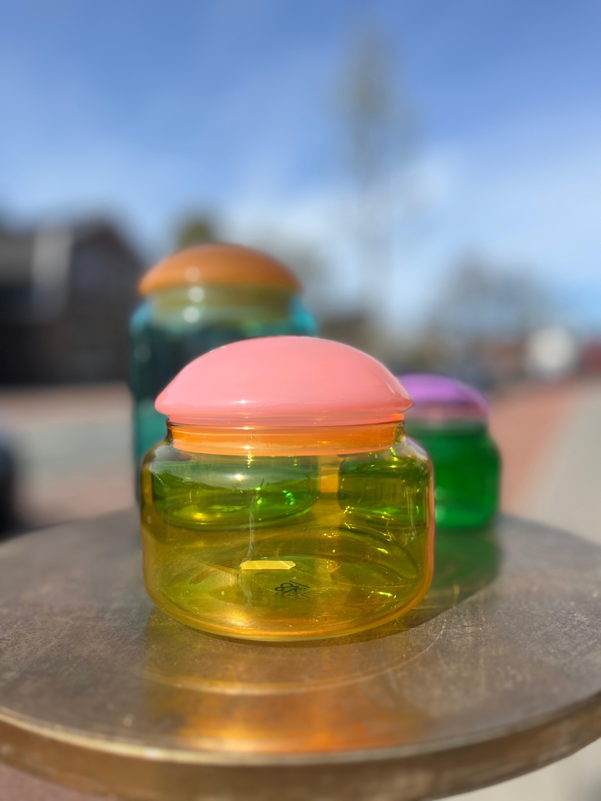 Leuke transparante glazen voorraadpot in frisse gele kleur met roze deksel.