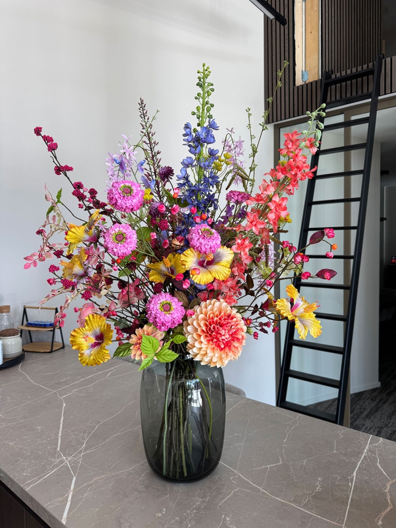 op de balie of op het bureau heeft staan. Het bloemenarrangement of boeket wordt altijd gemaakt met verse bloemen